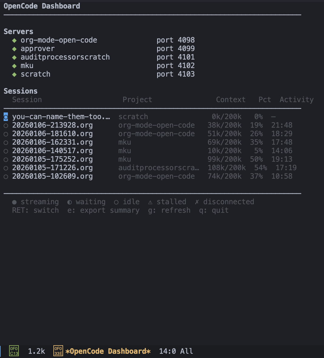 Using Emacs for talking to LLMs is nothing new, there’s dozens of plugins for it. There’s even a perfectly good Emacs plugin for Claude Code, but what it doesn’t do is leverage Org Mode. I wanted something that would allow for Org Mode’s persistent .org files and arbitrary code execution to be combined into an agent management framework, complete with file review, data exporting, and any other feature I might find useful. This is all wrapped together by an Emacs dashboard that lets me see the status of all of my servers and agents.